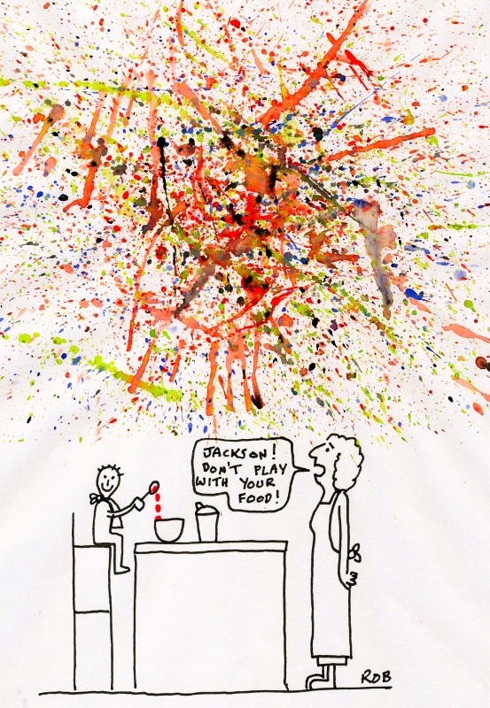 Rob’s cartoons this week were just so spot on. The Jackson Pollock one brought back memories of when our boys were 4 and 2 and a half. Rowan’s boss was due to come for dinner so the whole house had been spruced up. The boys were eating in the dining room while I put the finishing touches to dinner in the kitchen next door, Rowan and boss expected imminently. It went suspiciously quiet and then there was giggling. They’d been sat at opposite ends of the table to avoid arguments turning physical but that meant that there was further for the yoghurt to splatter when they decided to throw it at each other. And then they threw it at the walls, the carpet…..
